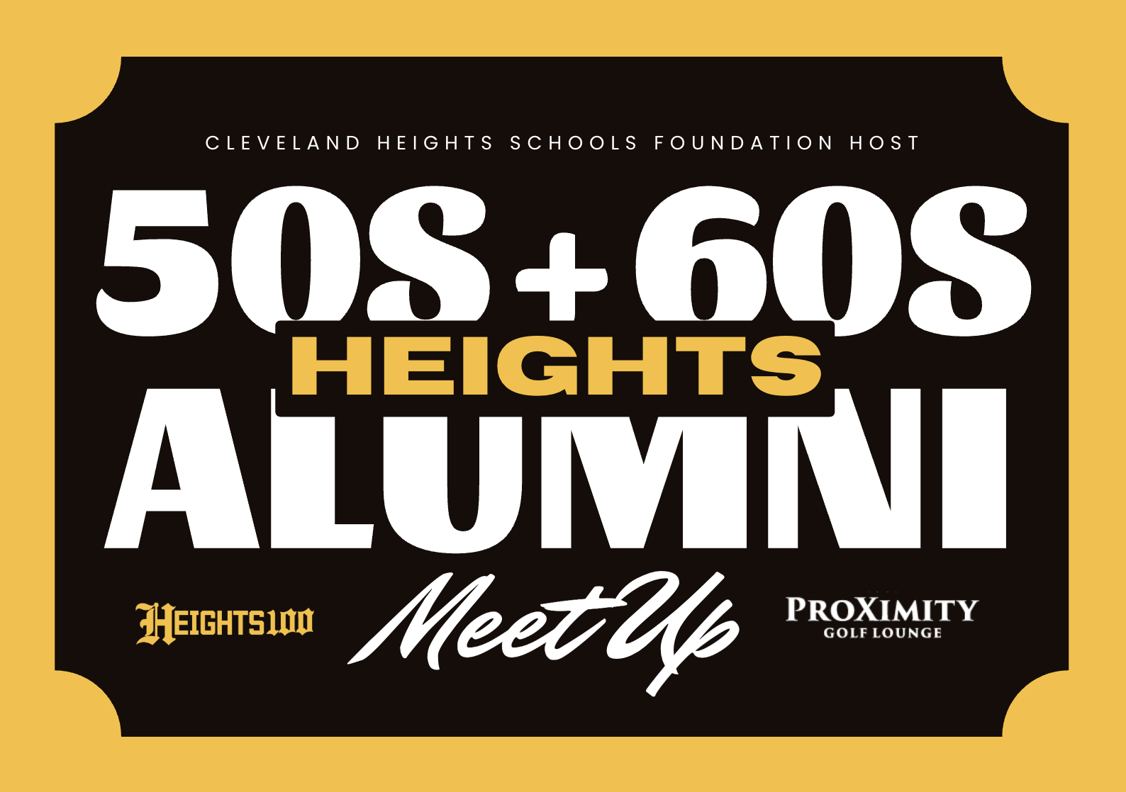 PROXIMITY GOLFJoin us for a night of rock ’n’ roll, Motown magic, and memories that never fade. From sock hops to soul grooves, let’s celebrate the decades that shaped our stories and set the stage for generations to come. Reconnect with classmates, relive the good times, and raise a toast to the golden years at the Heights Alumni Meet Up!